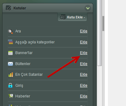 Kutuyu eklemek istediğiniz düzeni seçtikten sonra "Kutular" bölümünden banner kutusunu ekleyin. Fare ile kutuyu sürükleyerek yerini değiştirebilirsiniz. Düzenleme simgesine tıkladığınızda kutunu seçenekleri görüntülenecek. Kutunu ayarları ile ilgili daha fazla bilgiyi Tasarım editörü makalesinde bulabilirsiniz.