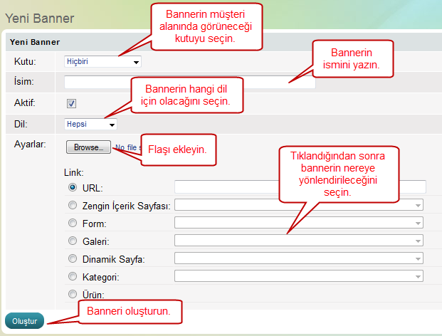 Eğer flash anımasyon baneri yüklemek isterseniz bu tip banneri seçmeniz gerekiyor. Geçerli format swf.