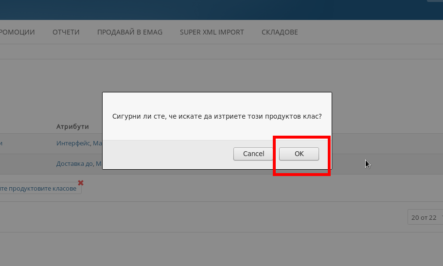 - След като натиснете някой от бутоните за изтриване ще ви излезне “Pop-up” прозорец, в който да потвърдите, че искате да изтриете избраните Продуктови класове. Ако сте сигурни, натиснете “ОК”.