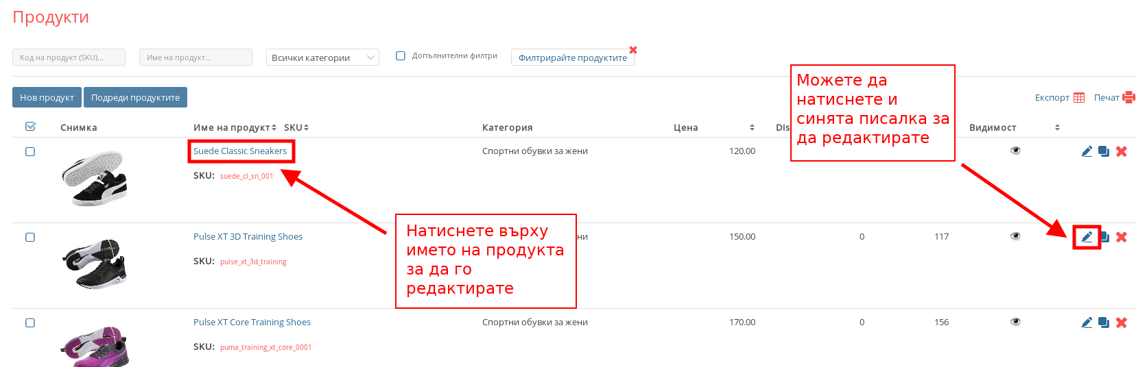 Друг начин за да влезнете в менюто за редакция на продукт е като натиснете върху иконката във форма на синя писалка, намираще се в най-дясната част на реда на продукта.