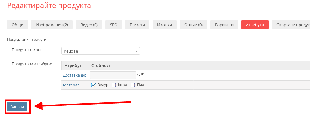 - След като сте влезнали в настройките на продукта натиснете върху бутона “Атрибути”.