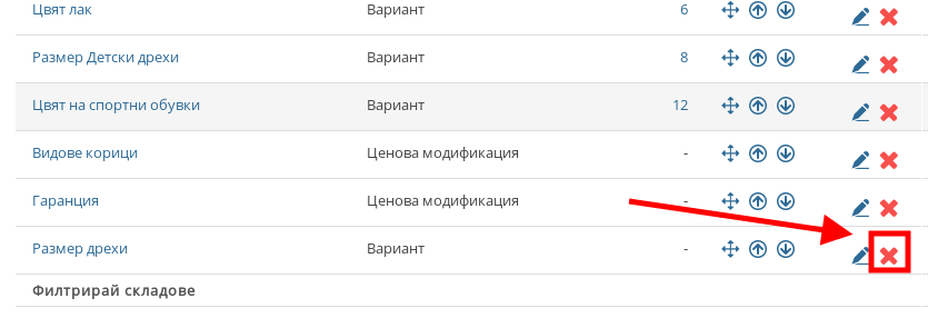 - Открийте групата, която искате да изтриете (ако имате голямо количество продуктови опции, можете да използвате филтриране в долния ляв ъгъл). След като я откриете, в лявата част на нейния ред натиснете червения бутон “X”.