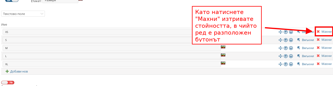 - Намерете стойностите, които искате да изтриете. В най-лявата част на реда на всяка стойност има бутон “Махни”, с който да изтриете избраната стойност от Продуктовата опция.