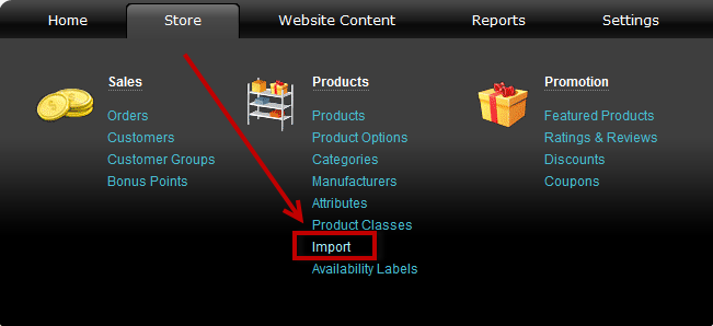>> Go to the Store menu, under Products click on Import link. 'Import' page appears.