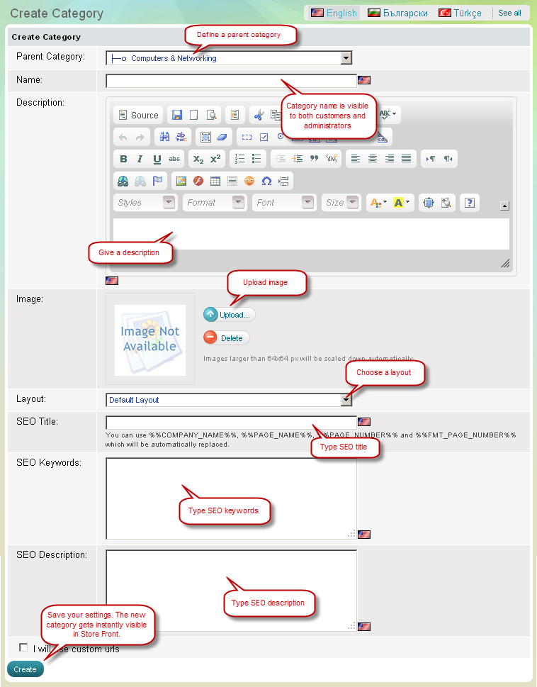 Usually categories are organized into levels to help customerseasily browse the store. Select a location for the new category. Youcan either put the new category at top level or subordinate it to anexisting category. The list of existing categories is provided in adrop-down menu. To put category at top level choose 'Top Level',otherwise select a category to which the new category belongs.