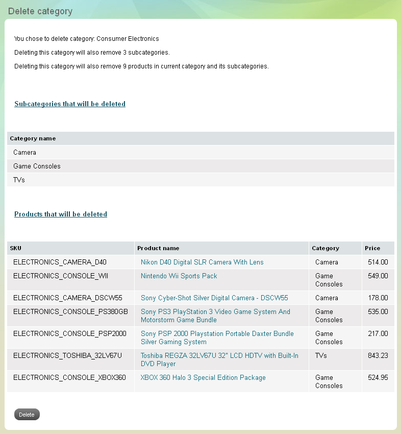 at the end of its row. 'Delete category' page appears. - Before deletion, you will see a summary of all subcategories and products that exist into the chosen category.