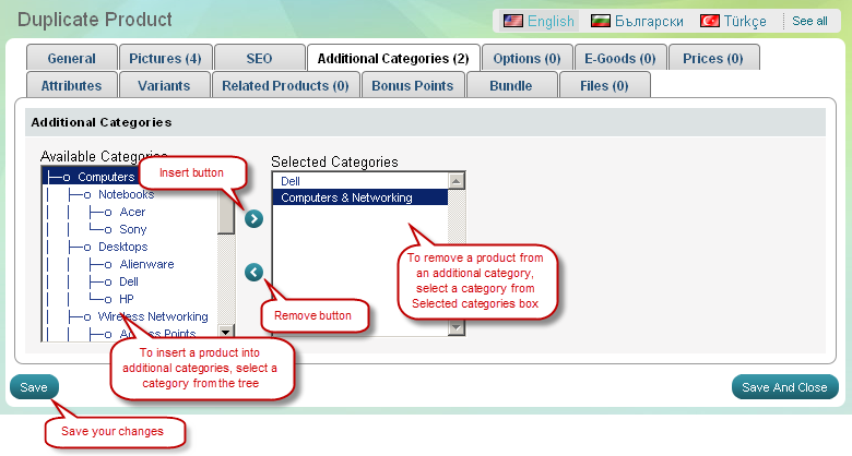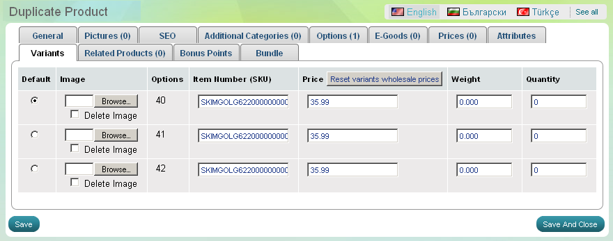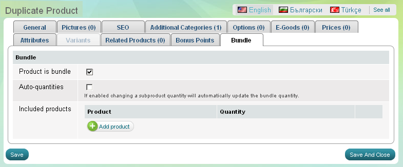 'Duplicate product' page is organized into 13 tabs to help you easily customize product details: 'General' tab, 'Pictures' tab, 'SEO' tab, 'Additional Categories' tab, 'Options' tab, 'E-goods' tab, 'Prices' tab, 'Attributes' tab, 'Variants' tab, 'Related Products' tab, 'Bonus Points' tab, "Bundle" tab.