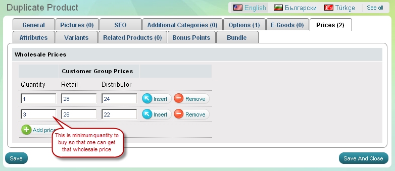 Use Prices Tab to define different pricing levels of a product as per customer group. Here you will see all customer groups, that already exist in your Summer Cart system. You can set up unlimited number of wholesale prices and quantity discounts.