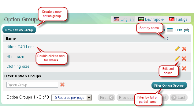 'Product Options' page lists all global options (such as Color, Size, Cover, Textile) you offer for the products in your store. At 'Product Options' page you can create, edit and delete entire option groups or manage only separate options. Also, you can easily find out options you are looking for with Sort and Filter functions.