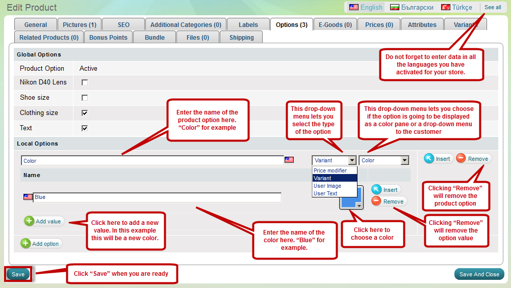 - Click on Update button to save changes. Active options get instantly visible in product's page in the store front.