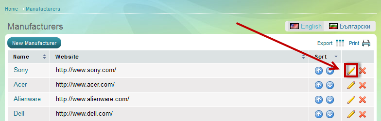 at the end of its row. 'Edit manufacturer' page appears.