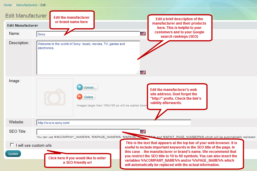 I will use custom urls: Check this box if you would like to provide the url address for this manufacturer's page, again - for better SEO.