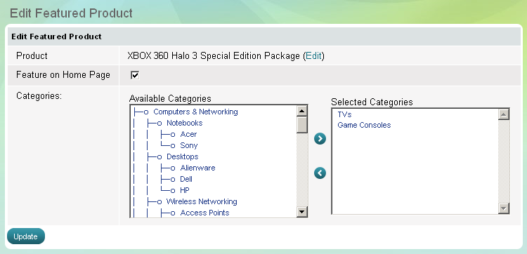 at the end of its row. 'Edit featured product' appears. - You can change the location of the featured product - promote it on 'Home' page and/or some selected categories.
