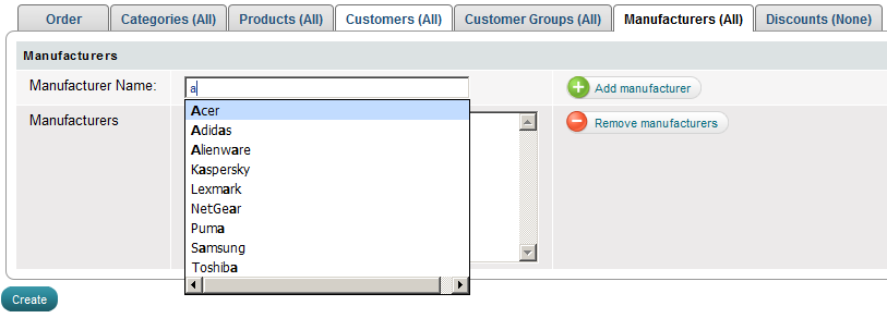 'Manufacturers' tab on 'Create Discount' page