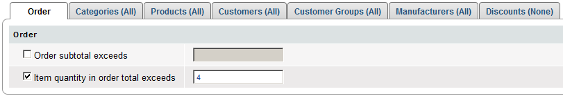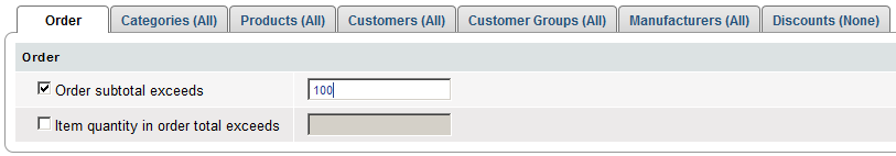 You can put one or more conditions on a discount offer with the use of Order tab, Categories tab, Products tab, Customers tab, Customer groups tab, Manufacturers tab and Discounts tab.