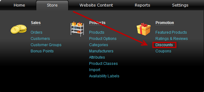 Go to the Store menu, under 'Promotion' click on Discounts link.