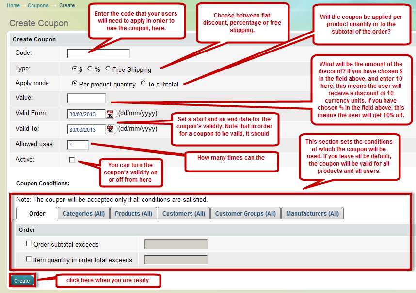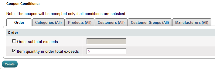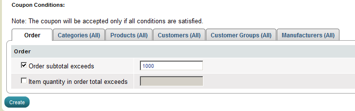 'Create Coupon' page has Code, Type, Apply mode, Value, Valid from, Valid to, Allowed uses and Active fields. At 'Create Coupon' page also there are 6 tabs that help you to set up 6 types of coupon conditions, or combinations of some of them: Order tab, Categories tab, Products tab, Customers tab, Customer Groups tab and Manufacturers tab.
