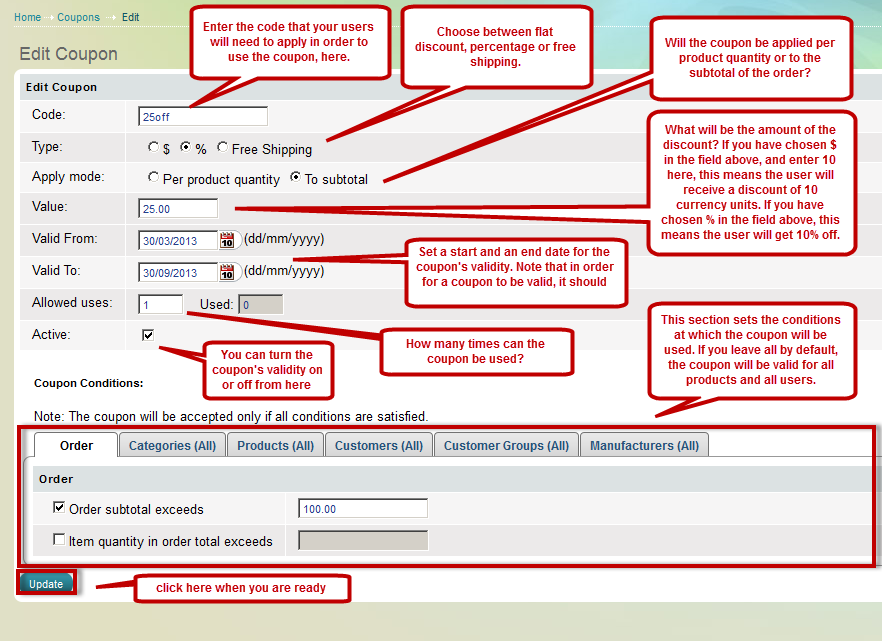 'Edit Coupon' page has Code, Type, Apply mode, Value, Valid from, Valid to, Allowed uses and Active fields. On 'Edit Coupon' page also there are 6 tabs that help you to set up 6 coupon conditions: Order tab, Categories tab, Products tab, Customers tab, Customer Groups tab and Manufacturers tab.