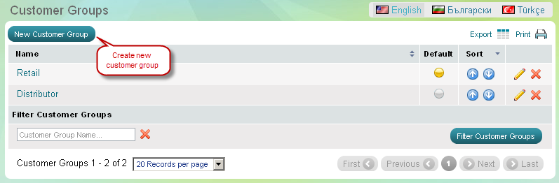 'Customer groups' page enables you to define types of customers whom you offer different levels of pricing. Here you can create new customer groups, edit or delete the existing ones. You can create unlimited number of customer groups, and easily manage them with the help of sorting and filtering options.