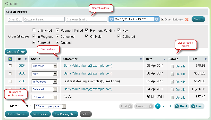 Use 'Orders' page to check up new orders, update the progress and status of new and existing orders, print invoices and packing slips for delivery.