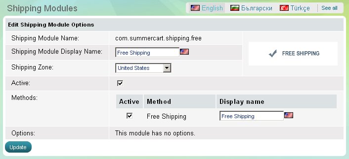 'Free shipping' module enables you to deliver products free of charge to a shipping zone of your choice. To configure 'Free shipping' module click on Options link at the end of its row.
