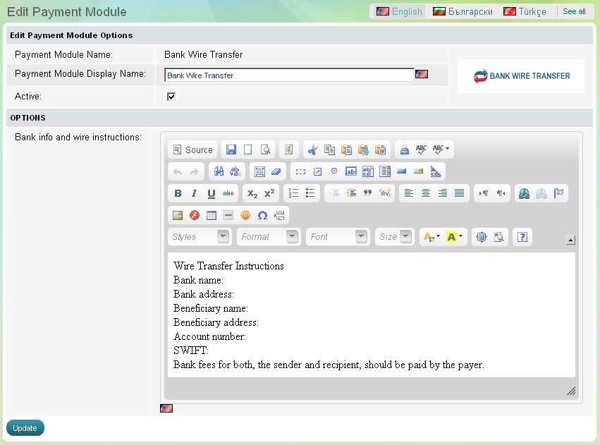 The module for bank wire payments can be activated or paused in a click at any time. A store owner needs to submit his/her bank account details and payment instructions. In the Store Front, this payment method shows to store customers the bank account they have to pay to.