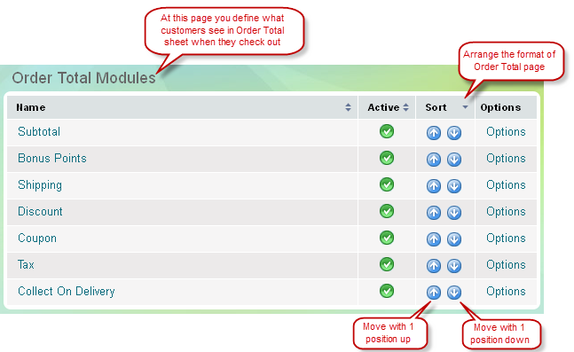 Use 'Order Total Modules' page to manage the format of Order Total price sheet. You can arrange the positions of Subtotal, Shipping, Tax, Discount and Coupon items using