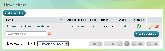'Newsletters' page shows all existing newsletters in your Summer Cart system. Here you can :