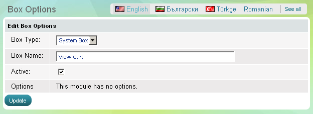 Use 'View cart' box to show to customers how many items they selected to buy and to provide a checkout link. The box has one parameter - to be active, which means it is visible on the website, or the opposite - to be inactive, then the whole box disappears.