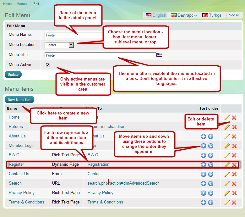 - Besides creating, editing and deleting items, you can arrange their sort order.