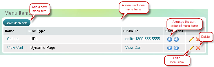 'Edit menu' page, Menu Items section
