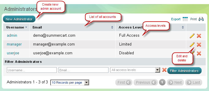 'Administrators' page help you control the access to the admin panel of Summer Cart. You can create multiple admin accounts and give them full access or limited access with selected permissions. You can also delete or disable accounts.