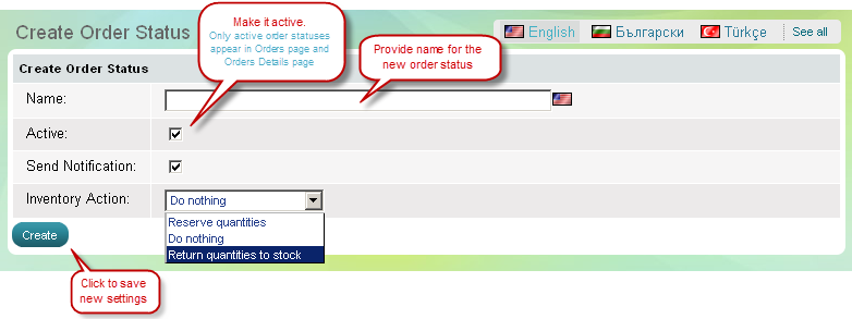 - Click on New Order Status button on top of page. 'Create order status' page appears.