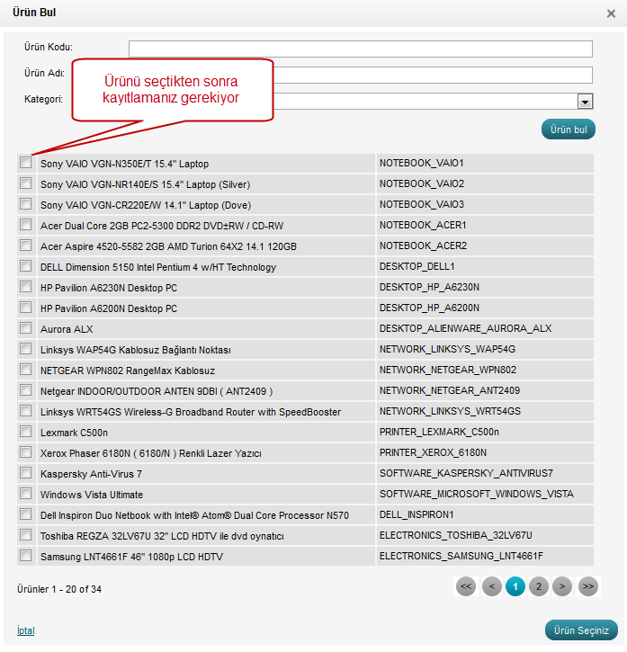 Ürün eklemek için "Ürün ekle" butonuna tıklayınız. Açılan sayfadan ürünü/leri seçebilirsiniz.