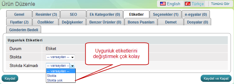 Bu bölümde ürünlerin durumlarını kontrol etmek varsayılan etiketleri kullanmayıp farklı etiketler kullanabilirsiniz.