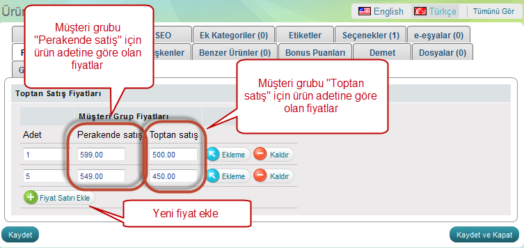 >> Her değişken için farklı fiyat - Resimde göründüğü gibi her değişken için farklı müşteri gruplari için fiyatlar girebilirsiniz.