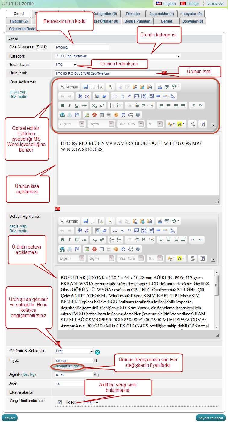 Genel olarak ürünleri düzenle sayfası ürün oluşturma sayfası gibidir. Resimde görsel editör gözüküyor. Görsel editör ile açıklama bölümlerinde metni kolayca stilize edebilirsiniz.