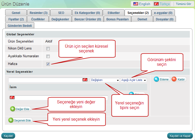 Bu ürüne ekli küresel bir seçenek var, ama siz kolayca başka bir seçenek ekleyebilirsiniz veya sadece bu ürün için uygulanacak yerel bir seçenek oluşturabilirsiniz.