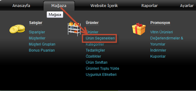 1. Menüden "Mağaza" >> "Ürünler" altında "Ürün Seçenekleri" bağlantısına tıklayın.