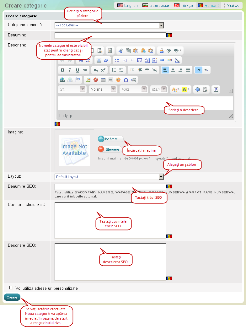 | Pont: | Când introduceţi descrierea unei categorii puteţi adăuga un text interesant ora pro-activ pentru a promova produsele pe care le-aţi inclus în categorie. |