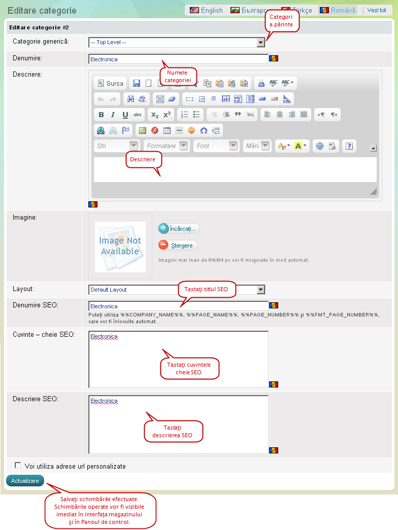 . Se va deschide pagina 'Editare categorie' . - Puteţi edita oricare din aceste câmpuri.