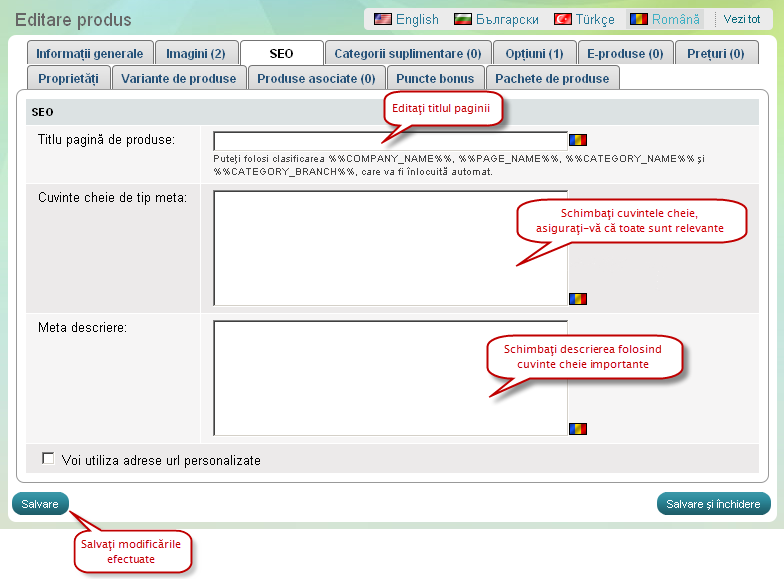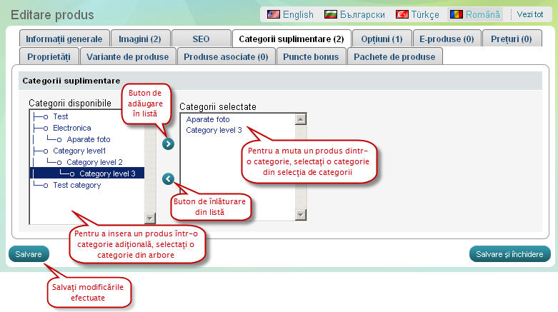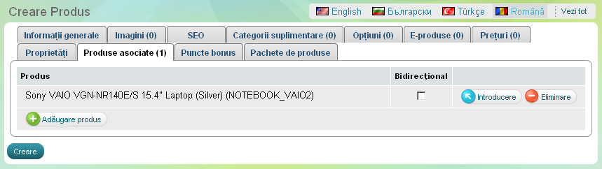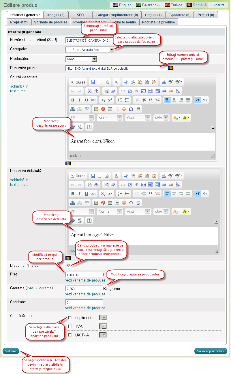 Pagina 'Editare produs' este organizată în 13 taburi care vă permit să schimbaţi cu uşurinţă detaliile produsului: General, Imagini, SEO, Categorii adiţionale, Opţiuni, Bunuri Virtuale, preţuri, proprietăţi, variante, produse înrudite, puncte bonus, pachete produse.