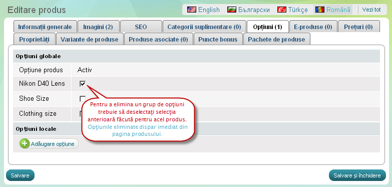 la capătul rândului. Se va deschide pagina 'Editare produse'. - Deschideți tabul 'Opțiuni' și folosiți căsuța de selecție pentru a înlătura grupurile de opțiuni nedorite.
