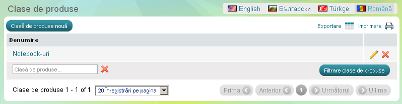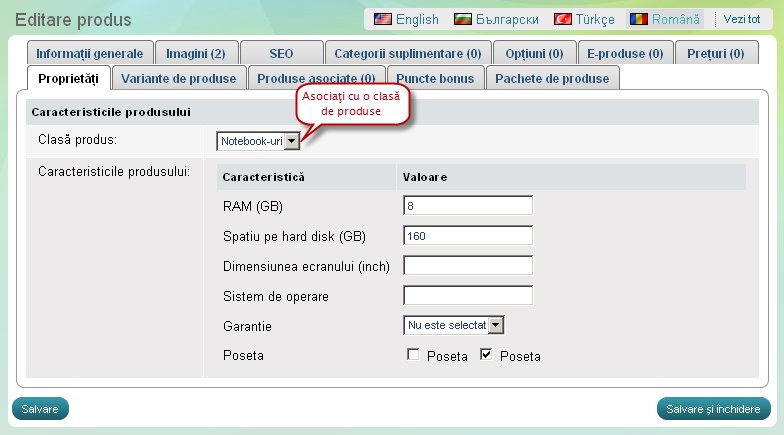 Folosiţi pagina 'Clase produse' pentru a crea o nouă categorie de produse (de ex. notebook) şi definiţi proprietăţile (sistemul de operare, greutatea, viteza procesorului, dimensiunea ecranului, etc.). Deasemenea, puteţi şterge o clasă de produse, dar puteţi şi să editaţi sau să ştergeţi anumite proprietăţi ale produsului. Puteţi adăuga până la 5 proprietăţi.
