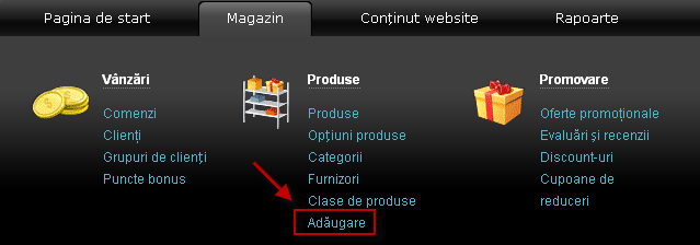 >> Mergeți la meniul Magazinului, la Produse, click pe link-ul Import. Se va deschide pagina 'Adăugare'.