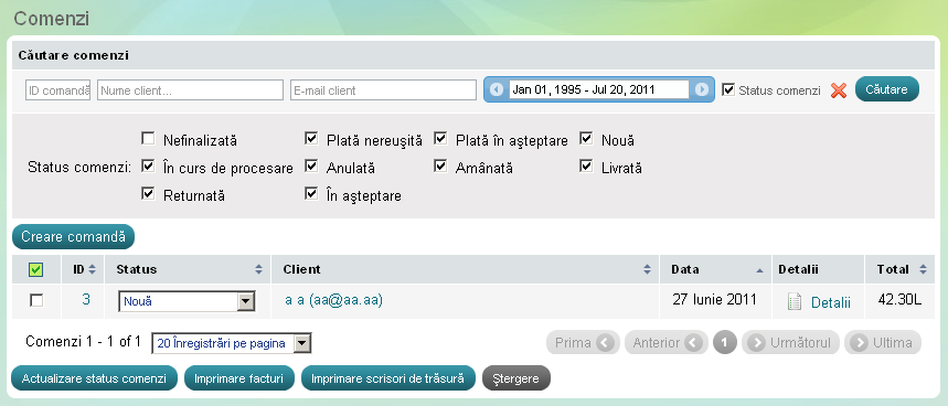 Pentru a găsi pe rapid un client tastaţi primele litere din numele acestuia sau o parte din adresa de email şi faceţi click pe butonul Filtrare clienţi. |