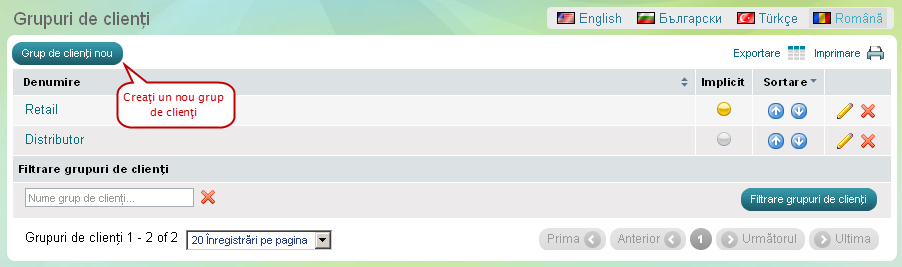 Pagina 'Grupuri clienţi' vă permite să definiţi diverse tipuri de cumpărători pentru care oferiţi diverse nivele de preţ. Aici puteţi crea noi grupuri de clienţi şi le puteţi administra cu uşurinţă cu ajutorul opţiunilor de sortare si filtrare.