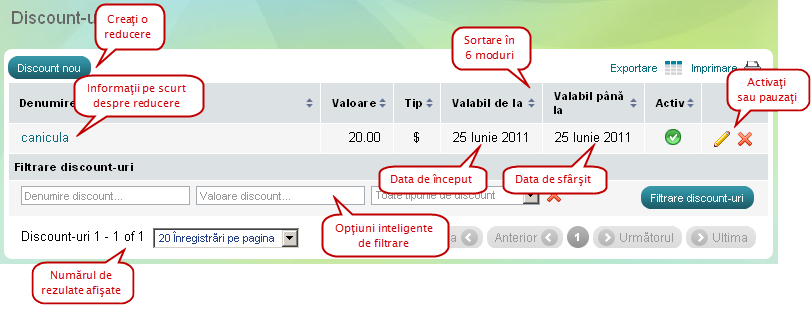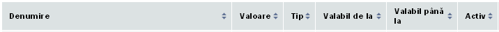 Dispuneţi de 6 moduri de sortare: după, nume, tip, valoare, valid de la/până la şi după stare aticvă/inactivă
