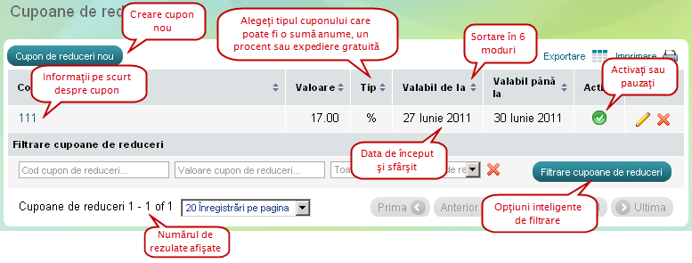 Pagina 'Cupoane' reprezintă un instrument de marketing şi afişează toate cupoanele de reduceri pe care le oferiţi clienţilor magazinului.