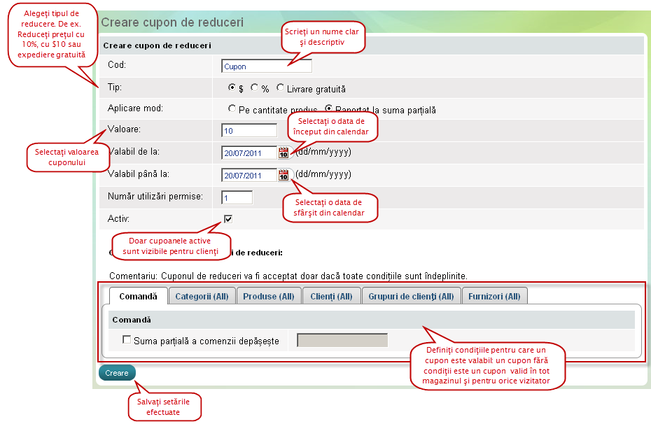 Pagina 'Creare Cupoane' are următoarele câmpuri: Cod, Tip, Valoare, Valid din, Valid până la, şi Activ. În pagina 'Creare Cupoane' găsiţi deasemenea 6 taburi care vă permit să setaţi 6 condiţii pentru cupoane: tabul Comandă, tabul Categorii, tabul Produse, tabul Clienţi, tabul Grupuri Clienţi şi tabul Producători.